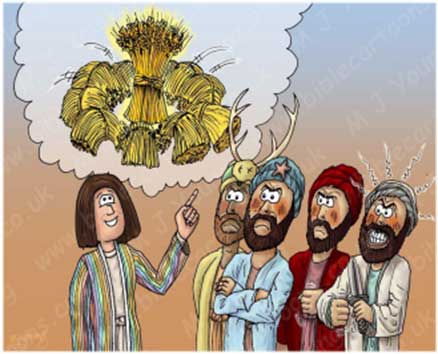 One day, Joseph had a dream. He told his brothers, and they got very angry. In the dream, Joseph and his brothers were tying up wheat in the field. Joseph’s bundle stood up tall, and his brothers’ bundles all bowed down to it. The brothers didn’t like hearing this. They asked, “Do you think you will be a king and rule over us?” They became even more jealous. Joseph had another dream. This time, he saw the sun, the moon, and eleven stars bowing down to him. When he told his father and brothers, his father scolded him, saying, “Do you think your mother, brothers, and I will bow down to you?” But his father thought about it in his heart, while his brothers grew even more jealous.