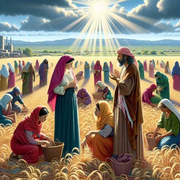 Ruth went to a field that belonged to Boaz, a relative of Elimelech, a kind and wealthy man. Unaware of this, Ruth came to his field to glean. It was the Lord’s plan that she came to the field owned by Boaz. He was God-fearing, good, and kind to everyone. He loved his servants and the servants too loved and respected their master. Boaz noticed Ruth working hard and asked about her. When he learned that she was taking care of Naomi, he was very impressed by her kindness. He told his workers to leave extra grain for Ruth to collect and offered her protection in his fields. The person in charge of the field gave a very good opinion about Ruth. She was hardworking and good-natured and was loved by everyone.